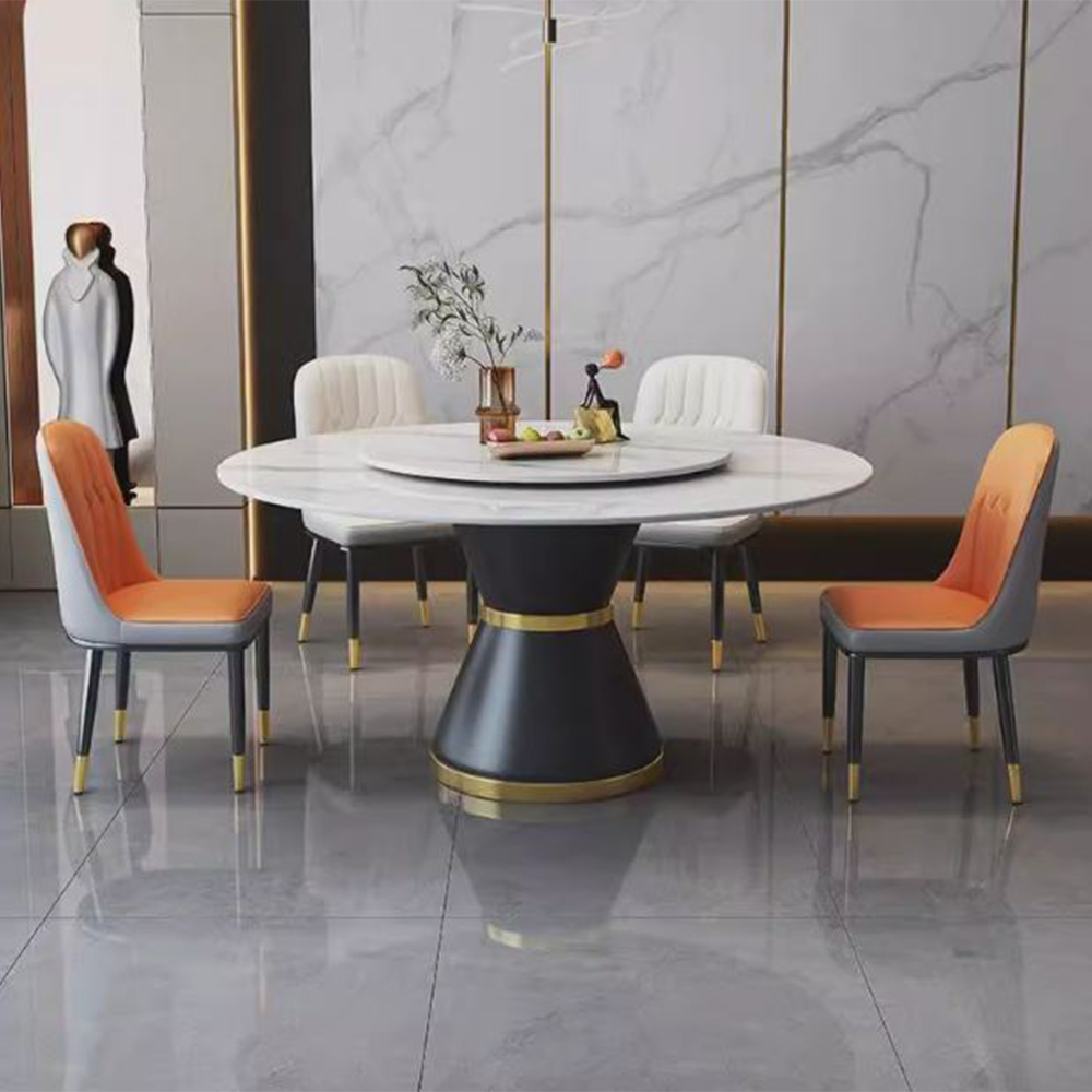 Bộ bàn ăn 4 ghế này sẽ mang đến một vẻ đẹp hợp thời theo phong cách Ý hiện đại. Thiết kế dạng bàn tròn mang lại cảm giác quây quần và sum vầy. Mặt bàn bằng đá có nhiều ưu điểm: chống ăn mòn, chịu nhiệt, chống thấm, chống bám bẩn. Chân bàn hình trụ độc đáo bằng kim loại sơn tĩnh điện không gỉ, bền bỉ – chắc chắn cực kỳ. Mặt bàn có trang bị mâm xoay 2 chiều 360°, khiến việc di chuyển các món ăn trở nên dễ dàng.
