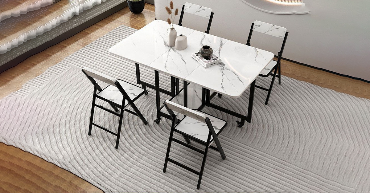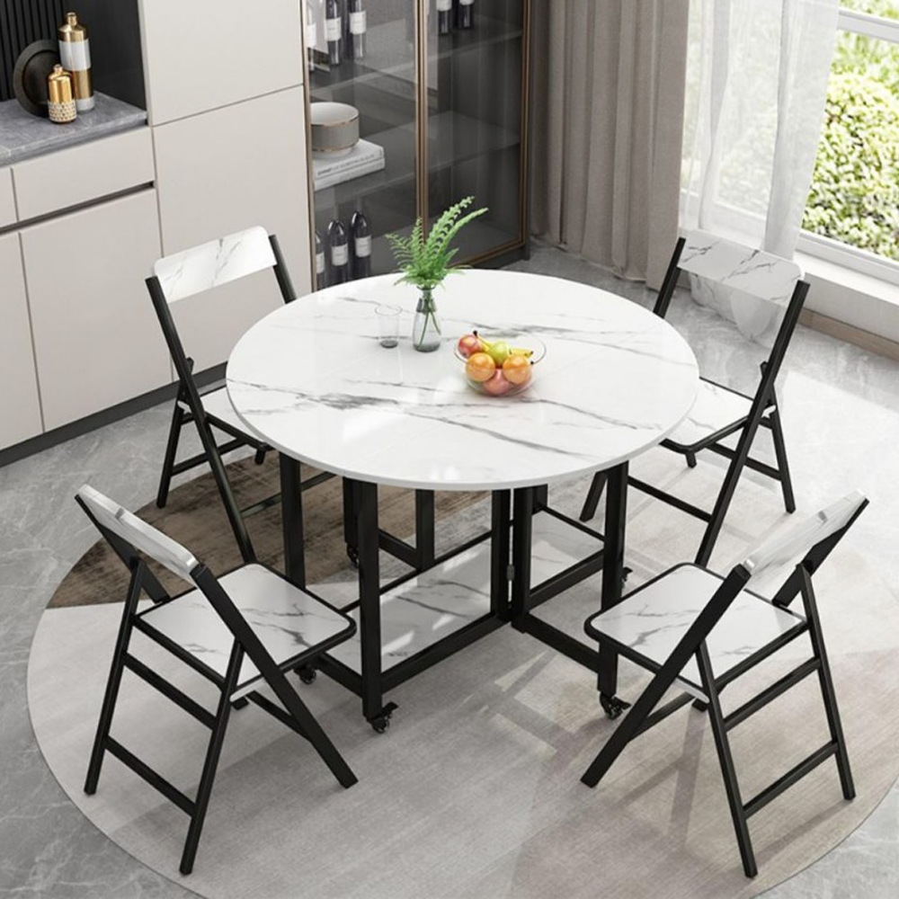 Bộ bàn ăn 4 ghế này có thiết kế cực sáng tạo khi sử dụng quy luật xếp gấp thông minh của nội thất Nhật Bản. Có thể gập mở một cách linh hoạt với 3 hình thái chính: Mở rộng hoàn toàn – Thu gọn 1 nửa – Gấp gọn hoàn toàn, đáp ứng mọi nhu cầu sử dụng. Bộ bàn được làm từ gỗ MDF đạt tiêu chuẩn E1, khung chân kim loại phủ sơn tĩnh điện chống gỉ – chống bong tróc. Các cạnh góc được bo tròn, đánh bóng kỹ lưỡng, an toàn tuyệt đối mỗi khi sử dụng.