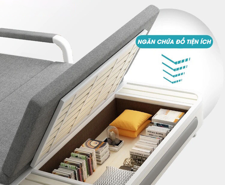 Giường sofa thông minh sở hữu thiết kế cực hiện đại với một ngăn chứa đồ rộng rãi ngay bên dưới mặt đệm, giúp bảo quản đồ đạc gọn gàng, ngăn nắp, tiết kiệm thời gian tìm kiếm, sửa soạn. Ở một số mẫu, ở phần tay vịn sẽ trang bị túi zip, giúp bạn có thêm không gian cất trữ các vật dụng cần thiết như: báo, tạp chí, điều khiển, ipad,...