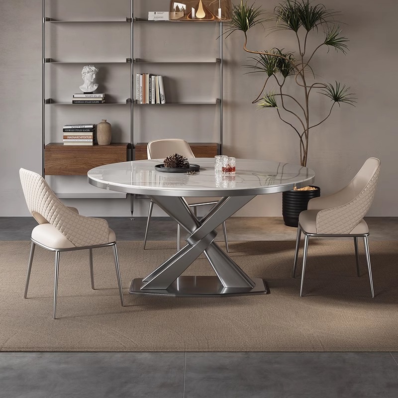 BÀN ĂN theo phong cách Ý đơn giản và thanh lịch. Mặt đá ceramic tone màu xám thời thượng. Chân bàn hình chữ X bằng thép carbon. Mặt bàn mở rộng/thu gọn linh hoạt.