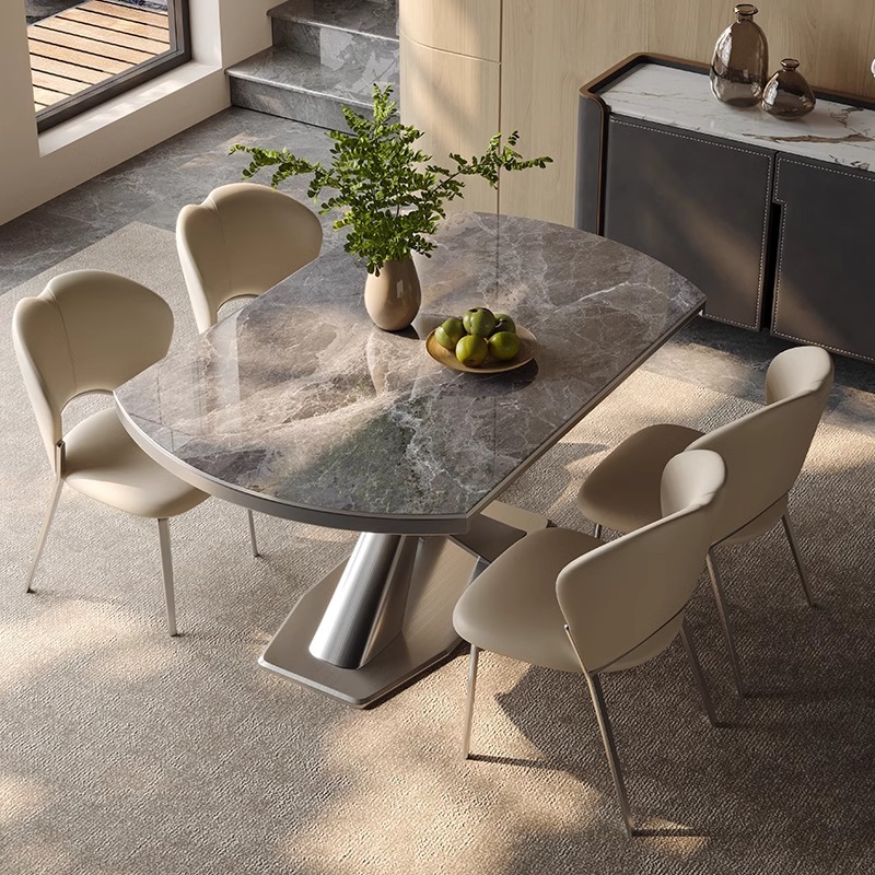 Mặt bàn bằng đá ceramic dày dặn, cứng cao, chịu nhiệt, chống thấm, không phai màu, dễ vệ sinh. Chân bàn thép carbon ổn định, chắc chắn, chịu lực cực tốt.