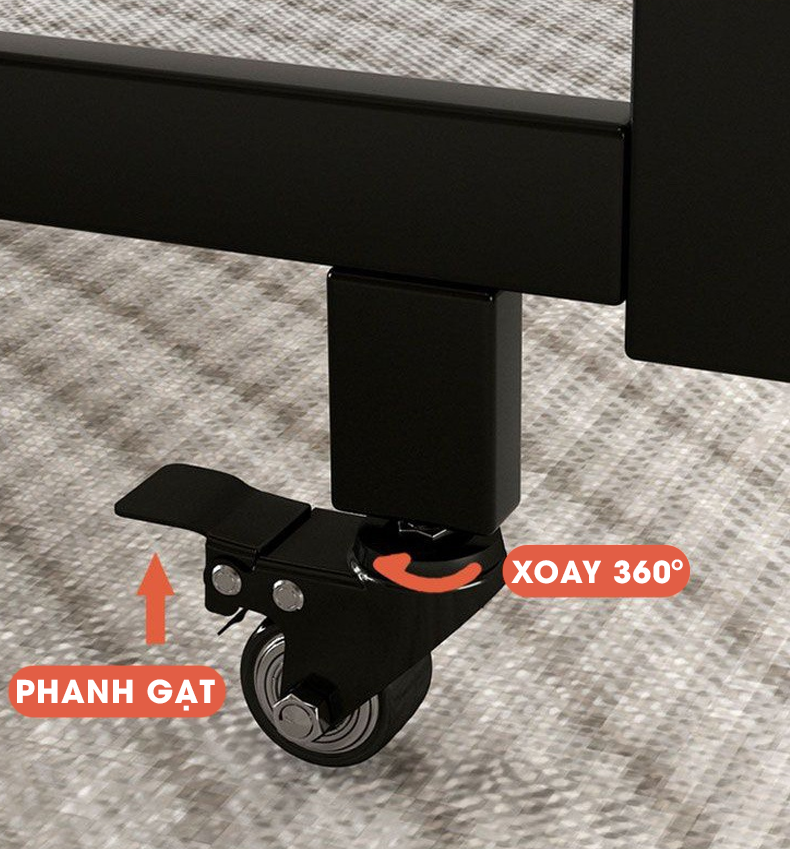 Bánh xe cao su, di chuyển êm ái, không phát ra tiếng ồn & bảo vệ mặt sàn tốt. Phanh gạt tiện ích, giúp cố định/khóa bánh xe khi không cần dịch chuyển. Có thể điều chỉnh chiều cao từng bánh nếu mặt sàn không bằng phẳng.