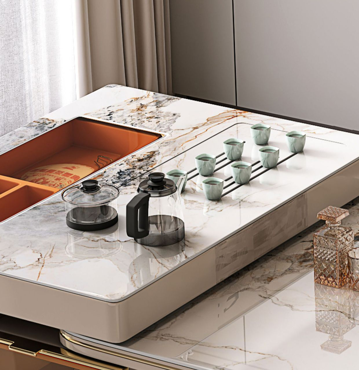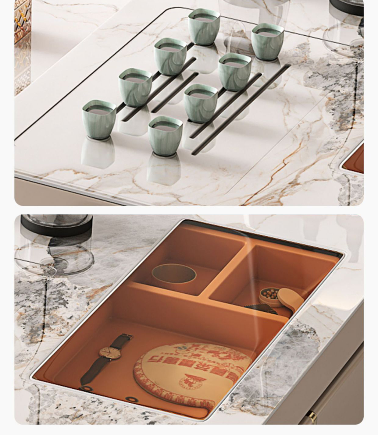 Trang bị hệ thống khay pha trà tự động với các đường dẫn nước, thoát nước tiện ích, giúp cho việc đun nước, pha trà trở nên dễ dàng.