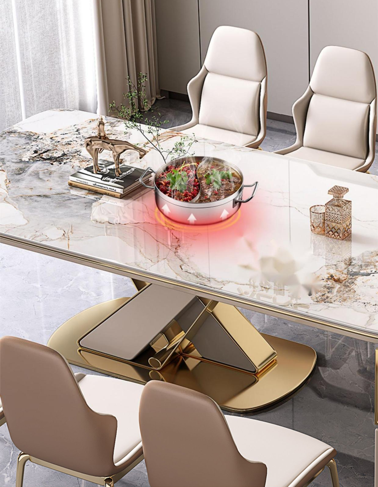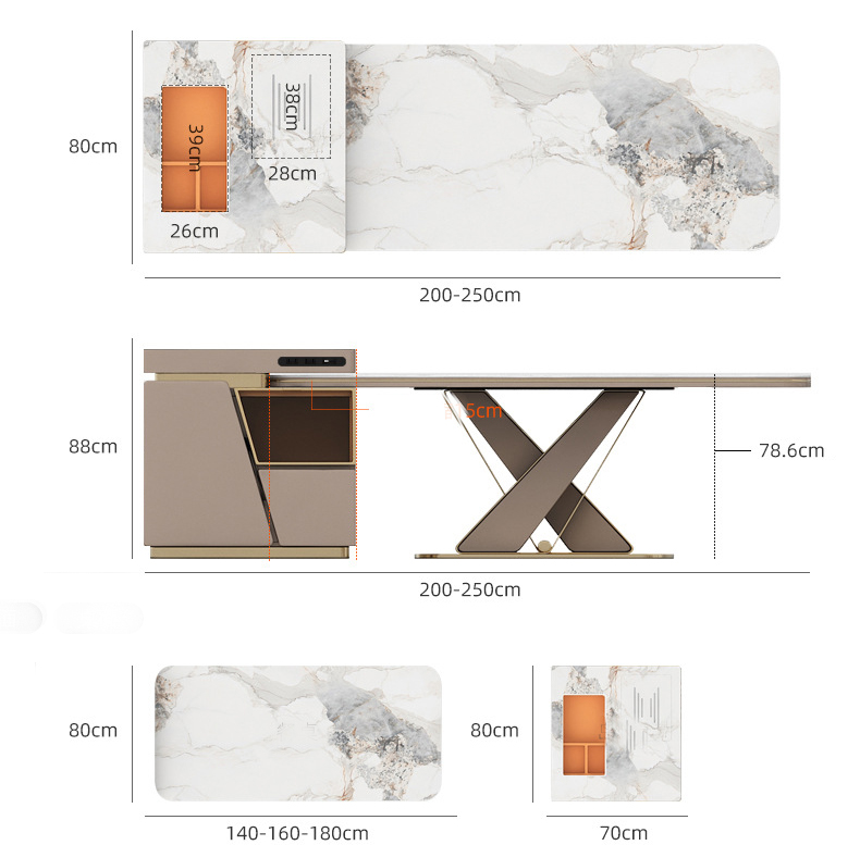 BỘ BÀN ĂN KẾT HỢP BÀN ĐẢO thiết kế độc đáo mang tính thời đại. Mặt bàn đá ceramic, khung chân trụ chữ X inox mạ vàng chuẩn 304. Trang bị hệ thống khay pha trà tự động. Có ngăn tủ chứa đồ rộng rãi. Tự do chuyển đổi đảo bếp sang bên trái và bên phải hoặc tách rời.