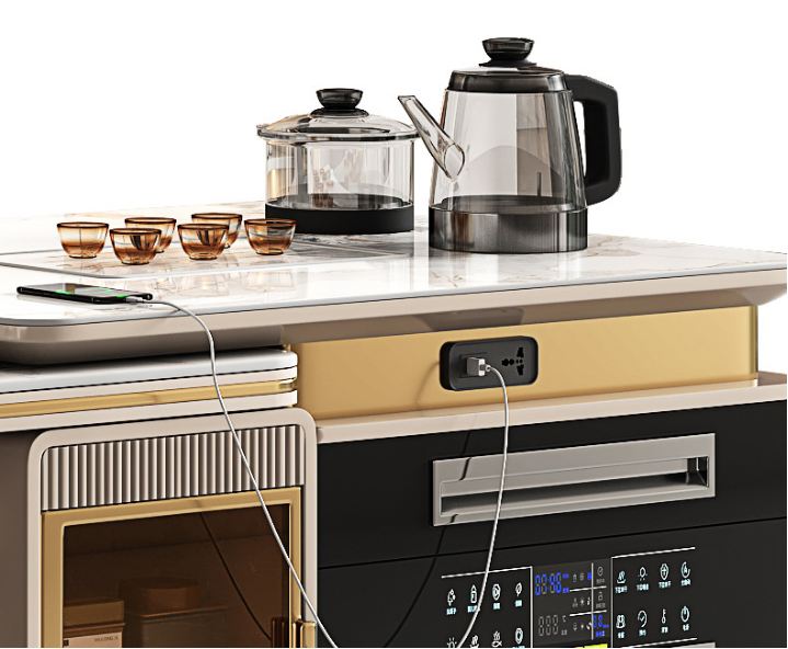 Trang bị cổng sạc usb và ổ cắm điện tiện lợi. Bàn đảo thiết kế có thể cắm dây điện âm mặt đất giúp che đường dây điện.