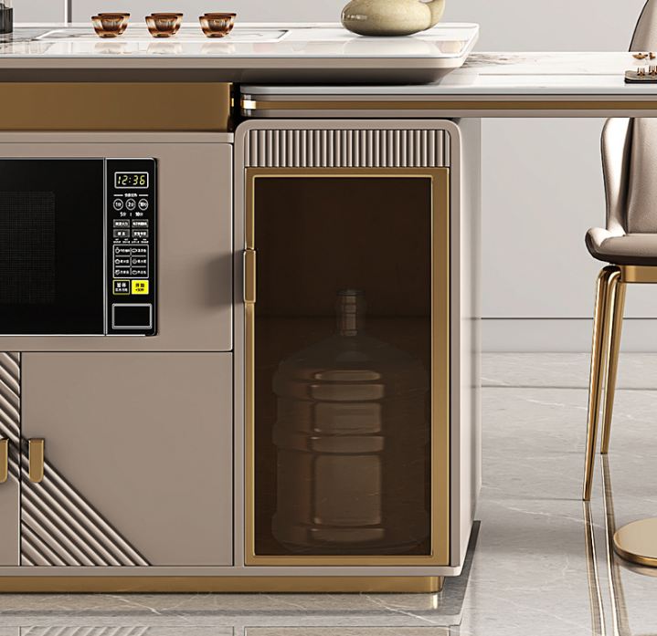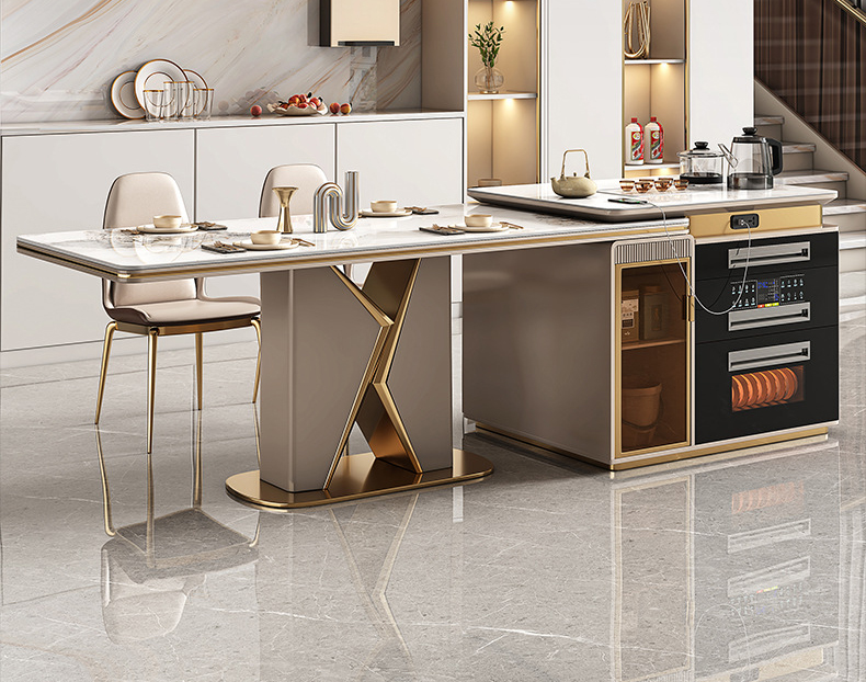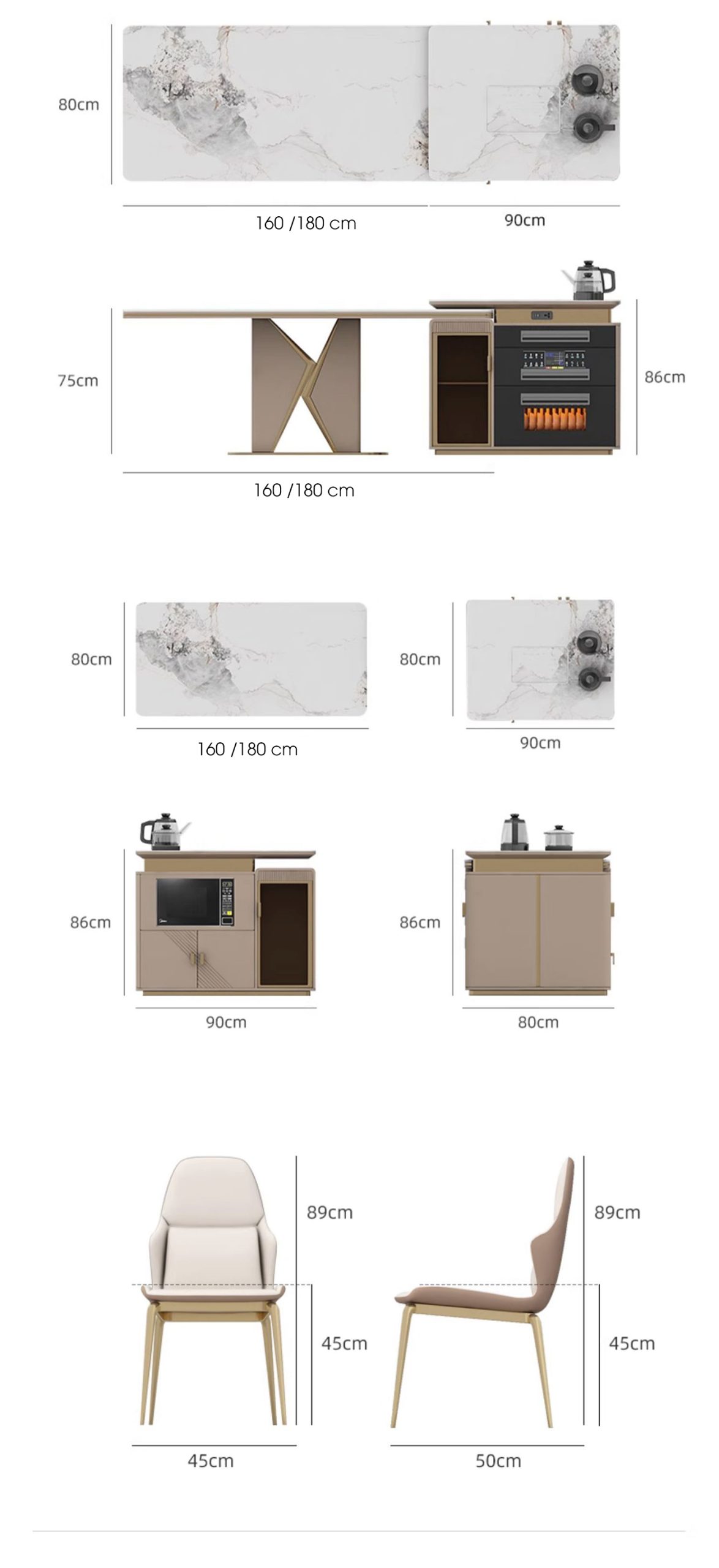 BỘ BÀN ĂN KẾT HỢP BÀN ĐẢO mặt bàn đá bóng kháng khuẩn nhập khẩu Ý. Chân trụ và tủ gỗ ván dán plywood, phủ sơn công nghệ nano. Chân đế inox 304 mạ vàng PVD. Trang bị bếp từ âm, máy sấy bát đũa, lò vi sóng, công cụ pha trà, tủ chứa đồ, cổng sạc usb và ổ cắm điện. Tự do chuyển đổi bàn đảo.