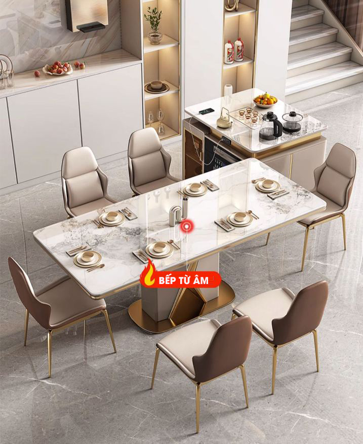 Bếp từ âm ngay chính giữa mặt bàn ăn, giúp nấu chín/làm nóng trực tiếp ngay tại bàn mà không phải đi đâu xa. Tiện lợi khi gia đình muốn ăn lẩu hoặc các món ăn cần đun nóng liên tục,...