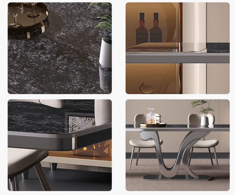 BỘ BÀN ĂN thiết kế tối giản đậm chất Ý. Mặt bàn hình chữ nhật, khung chân tạo hình chữ N độc đáo. Mặt đá ceramic, khung chân thép mạ titan màu đen. Sản phẩm đi kèm ghế.