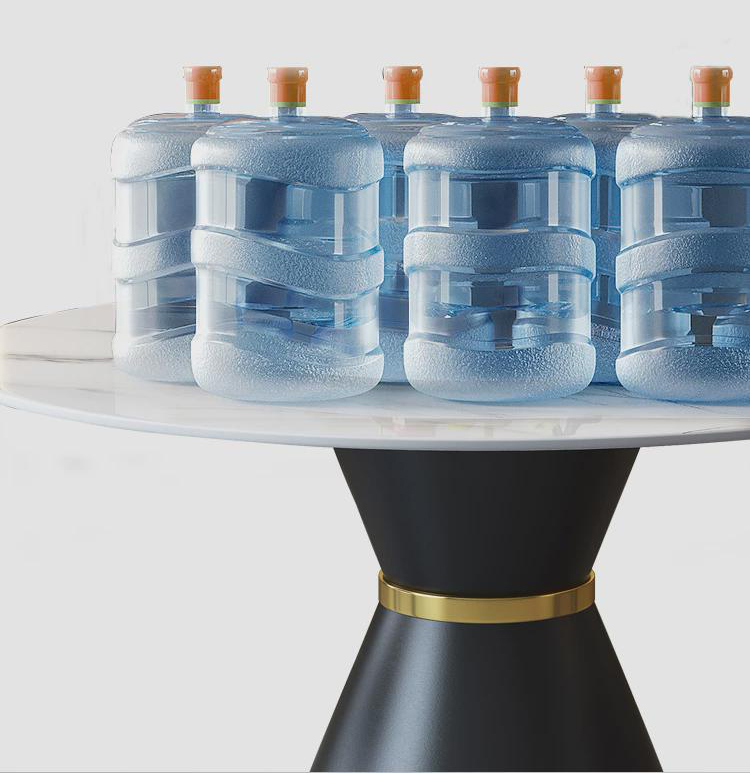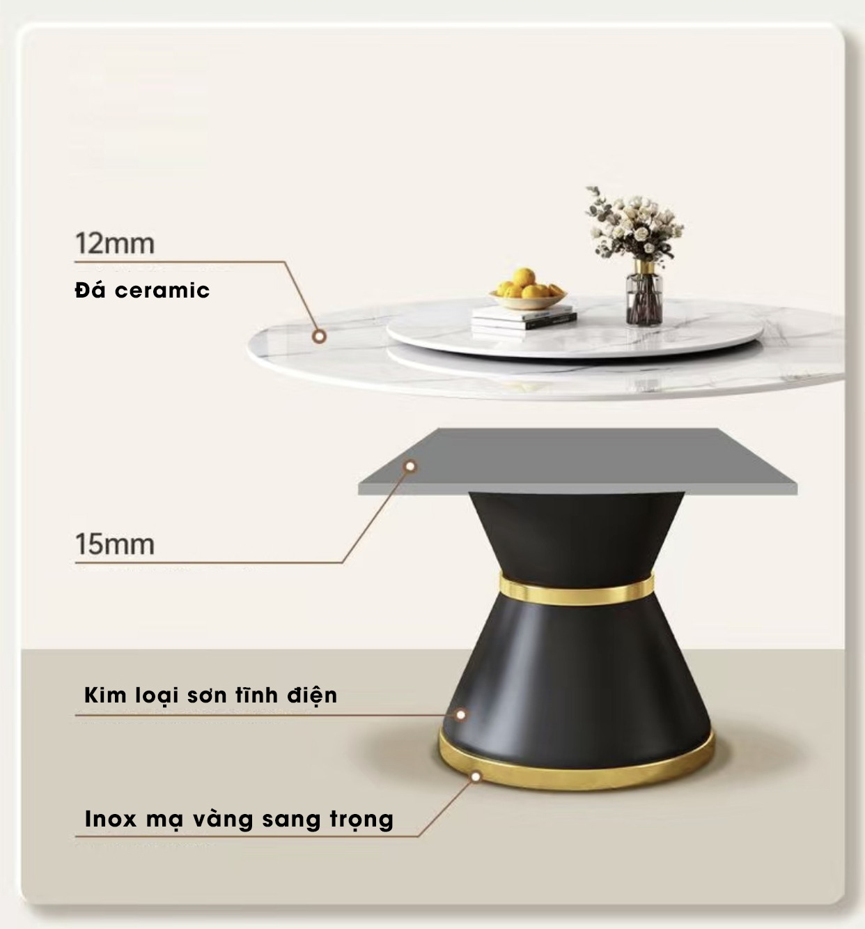 Mặt bàn hình tròn tượng trưng cho sự hòa hợp tạo nên hạnh phúc viên mãn, giúp các thành viên trong gia đình gắn kết nhau hơn, mang đến không gian quây quần – ấm cúng – sum vầy. Đá ceramic hay còn gọi là đá phiến, có tác dụng thu hút vận may, mang tới những khởi sắc đáng ngưỡng mộ trong công việc và cuộc sống. Ngoài ra, phần inox mạ vàng sang trọng ở phần chân bàn cũng ngầm thể hiện sự giàu sang và tài lộc.