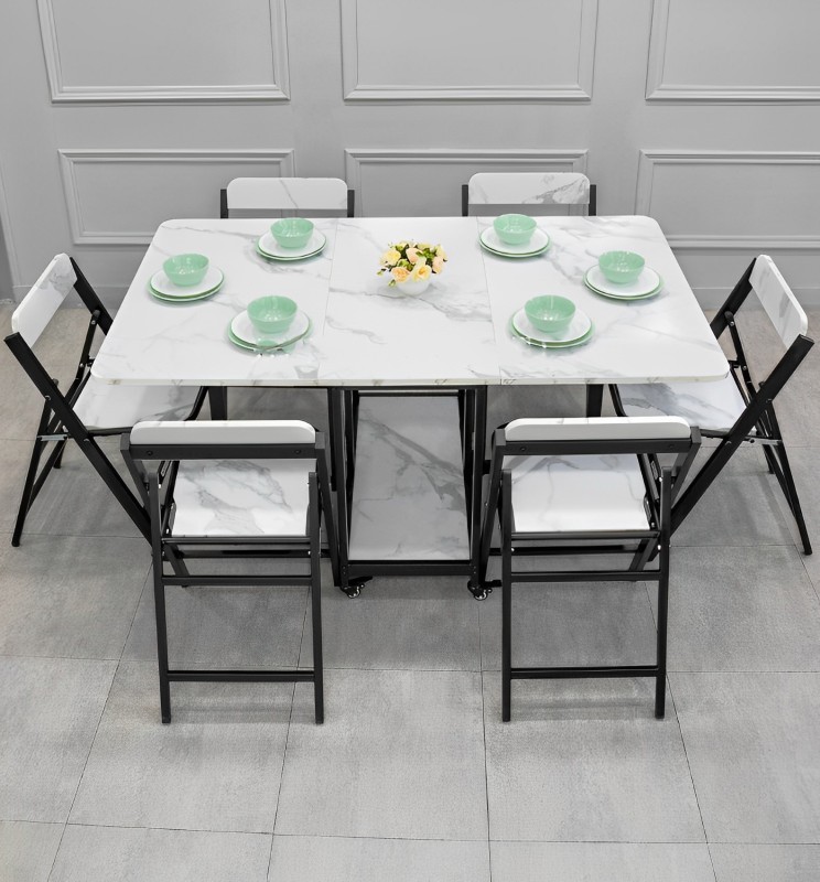 Bàn có thiết kế rất độc đáo, khi bàn gập lại, 1 khoảng không thông nhau bên dưới gầm bàn sẽ xuất hiện. Tận dụng triệt để khoảng không đó để lưu trữ ghế ngồi khi không sử dụng (có thể chứa được 4/6 chiếc ghế), giúp tiết kiệm không gian một cách tối đa.