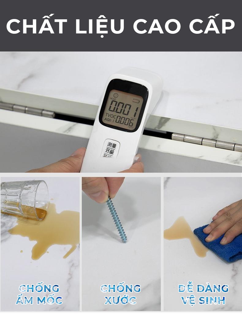 Mặt bàn dày dặn với độ dày lên tới 18mm, chịu được tải trọng lớn, không dễ biến dạng, để đồ thoải mái không lo nứt gãy.