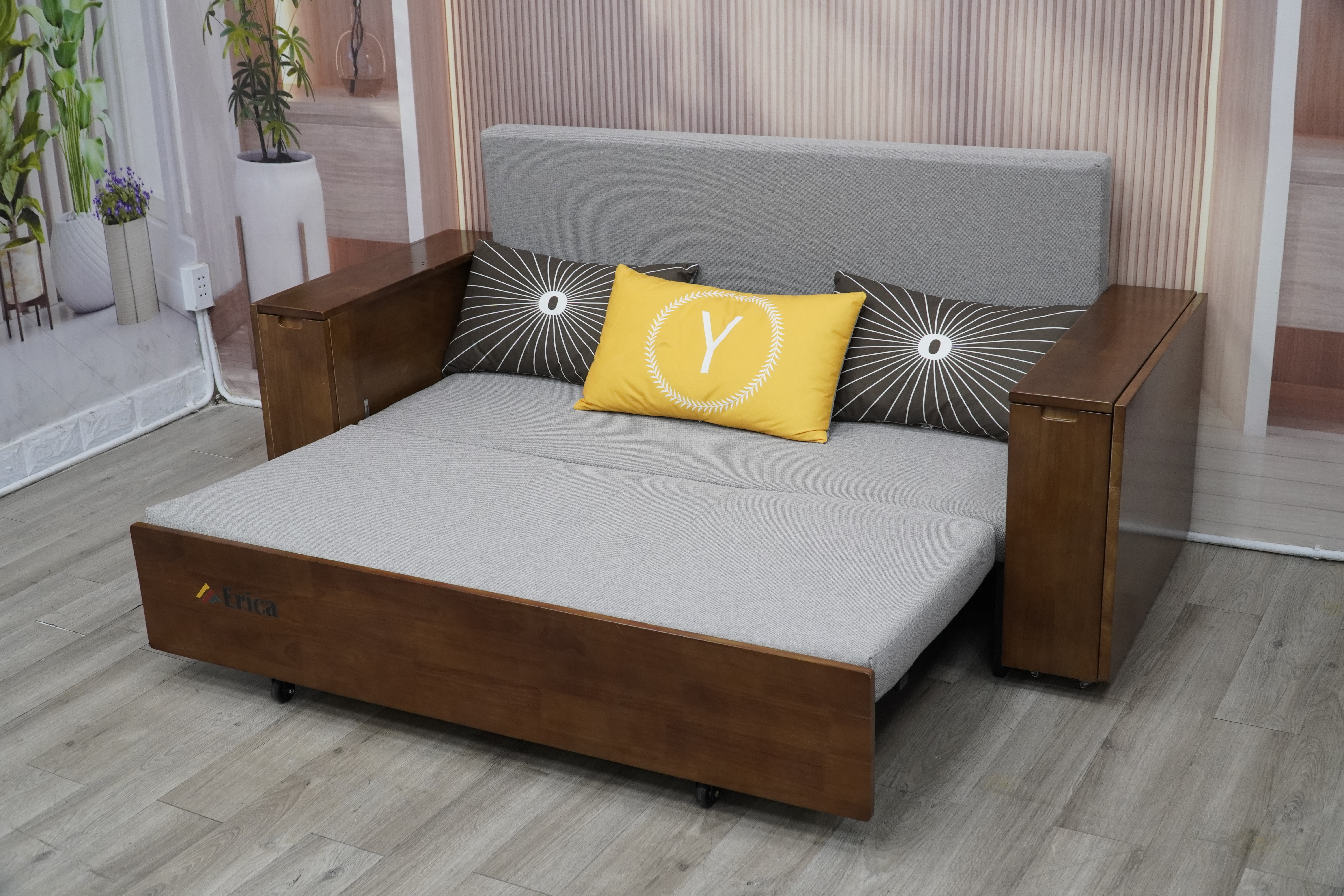 Nếu bạn là một người theo đuổi chủ nghĩa tối giản thì ghế sofa giường gỗ ERICA – EC5 sẽ là sự lựa chọn cực hoàn hảo. Điểm nổi bật của em nó là cách sử dụng hiệu quả, đầy sáng tạo những nguyên vật liệu sẵn có như vải & gỗ tự nhiên để góp phần tô điểm cho không gian. Sở hữu thiết kế đẳng cấp với 6 chức năng trong 1 sản phẩm: sofa ngồi, sofa thư giãn, giường ngủ, bàn trà/bàn làm việc, bàn ăn, tủ đựng đồ; đáp ứng mọi nhu cầu sử dụng. Bệ tỳ tay bằng gỗ cao su chất lượng cao đã qua xử lý, cho khả năng chống nấm mốc/mối mọt tốt. Kết cấu gỗ kiên cố, cứng cáp, nói không với vỡ nứt, chống chịu tốt với điều kiện khí hậu khắc nghiệt của Việt Nam.