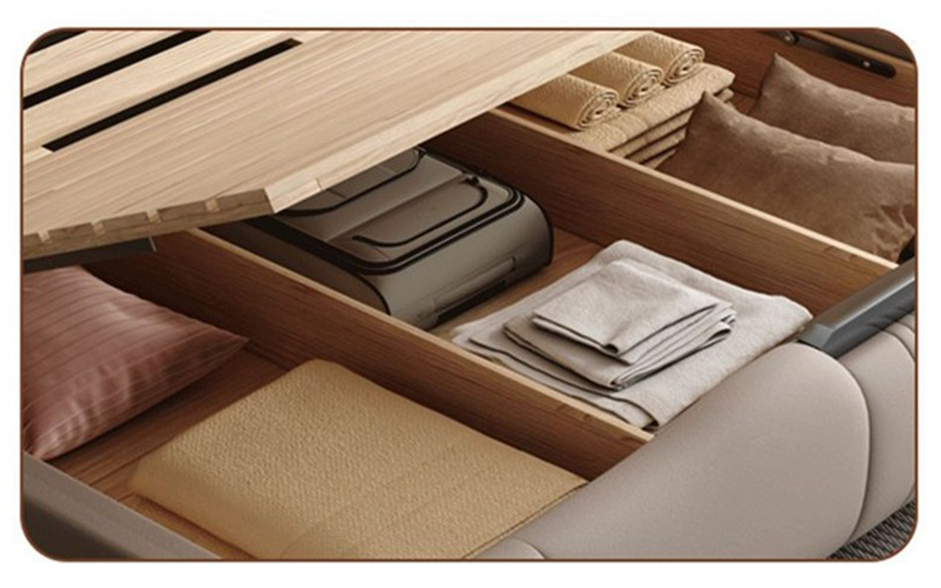 Ngoài lựa chọn khung nan gỗ chắc khỏe, giường còn có phiên bản nâng hạ bằng thủy lực, mang đến không gian chứa đồ rộng rãi, gọn gàng và tiện dụng cho gia đình.