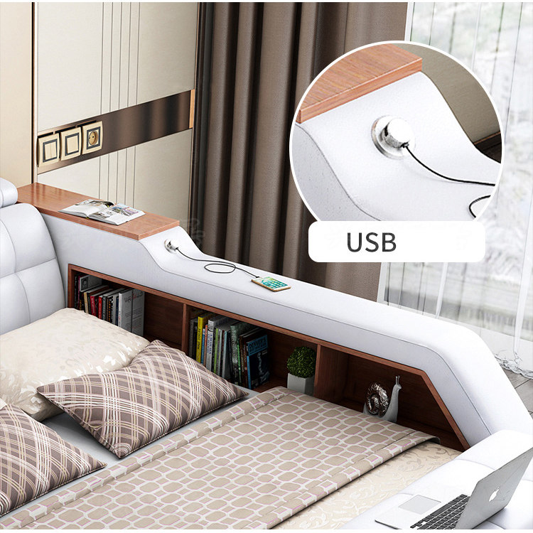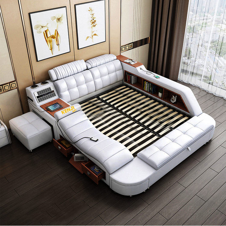 GIƯỜNG NGỦ MASSAGE trang bị nhiều tiện ích: đầu giường điều chỉnh linh hoạt, loa bluetooth, ghế massage, két sắt, bàn trang điểm kiêm bàn trà, quạt gió, tủ lưu trữ, cổng sạc usb, ghế đẩu di động,...
