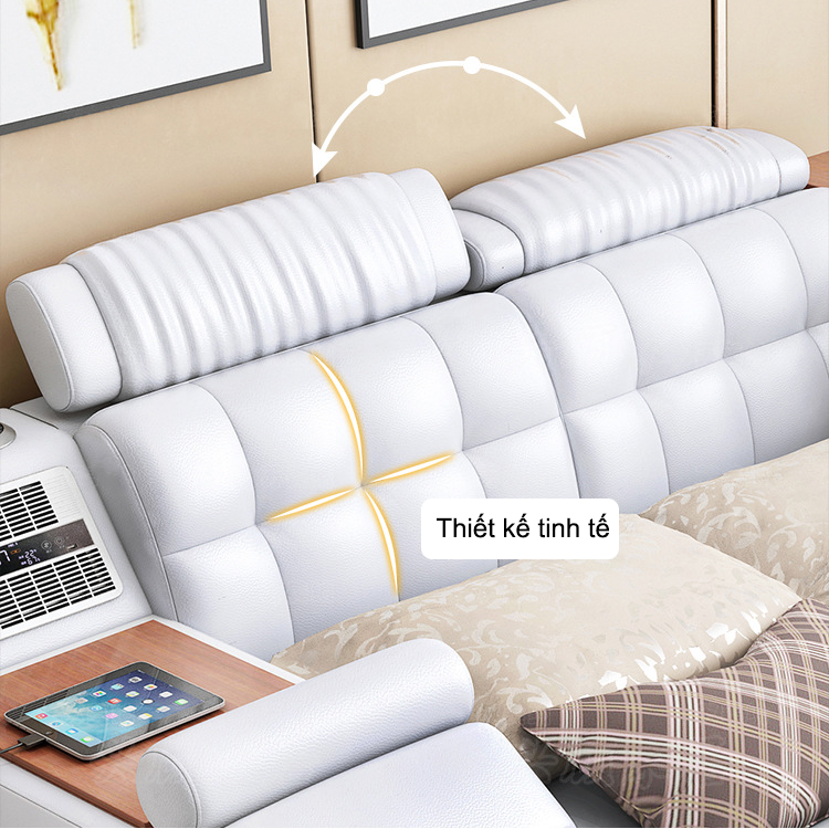 Chiếc giường đem đến cho người dùng một hệ thống lưu trữ thông minh với các ngăn kéo/ hộc tủ/ kho lưu trữ đóng mở tiện lợi để đựng thêm nhiều vật dụng cá nhân mà không cần sắm thêm tủ đựng đồ. Bên cạnh đó, sản phẩm còn tích hợp cổng sạc usb, ghế đẩu di động,… vô cùng tiện nghi.