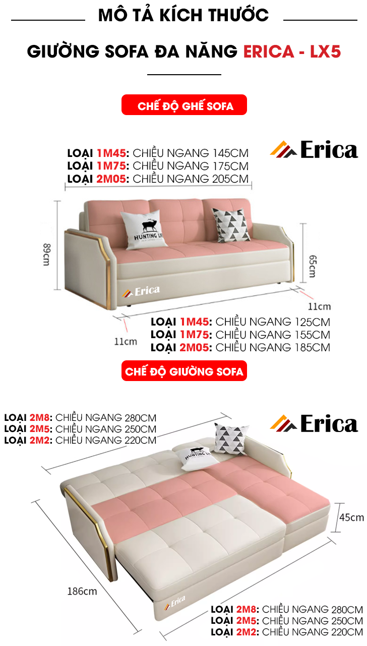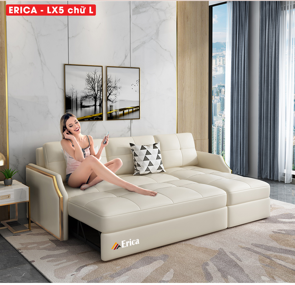 Không gian sống ngày càng thu hẹp nên những chiếc giường sofa thông minh trở thành ưu tiên hàng đầu của nhiều gia đình Việt, để tối ưu hóa diện tích nhà ở, tiếp cận xu hướng sống tối giản nhưng tiện nghi. ERICA - LX5 cực thích hợp với các không gian có diện tích hạn chế như: căn hộ mini, chung cư gia đình nhỏ, nhà tập thể…