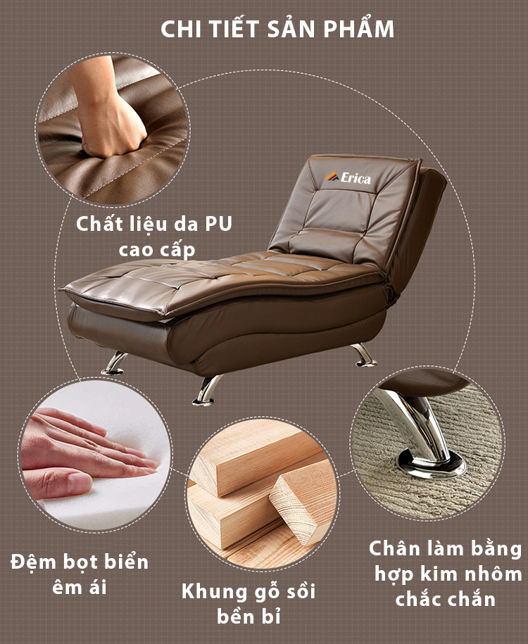 ERICA – GT6 được cấu tạo thành một khối nhưng khá linh động khi sử dụng. Có thể thay đổi dáng tựa lưng theo ý muốn nhờ sở hữu cơ chế nâng gập 3 góc độ: 90°, 145° và 180°. Bởi vậy, đây được coi là một sản phẩm nội thất thông minh mang phong cách hiện đại đem lại nhiều tiện ích cho người dùng. Bạn có thể dễ dàng dựng phần lưng ghế để biến nó thành chiếc ghế ngồi xem TV, đọc sách, uống café. Ngoài ra, bạn cũng có thể hạ phần lưng với góc nghiêng hợp lý, để có được giây phút nghỉ ngơi đúng điệu, thoải mái yên giấc.