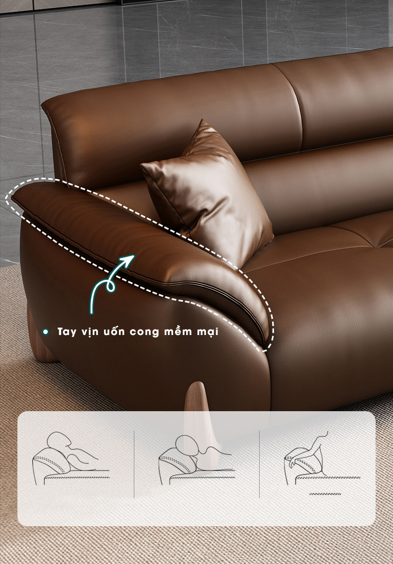 Không cần cầu kỳ hay rườm rà, sofa tạo dấu ấn riêng bằng những đường nét mềm mại, thanh thoát. Phần tựa lưng, mặt ghế và tay vịn được thiết kế liền mạch – uốn lượn nhẹ nhàng, tạo nên tổng thể duyên dáng mà vẫn vững chãi. Tựa lưng thấp và đệm dày dặn giúp chiếc sofa mang hơi hướng của những mẫu lounge hiện đại – lý tưởng cho những ai yêu thích sự thư giãn đầy phong cách.
